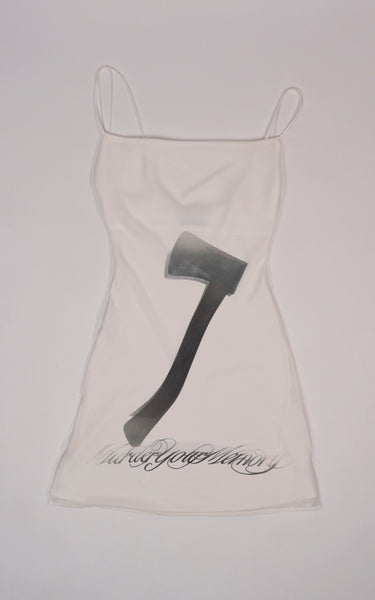 Stretchy white dress with axe design and “murder your memory” text.