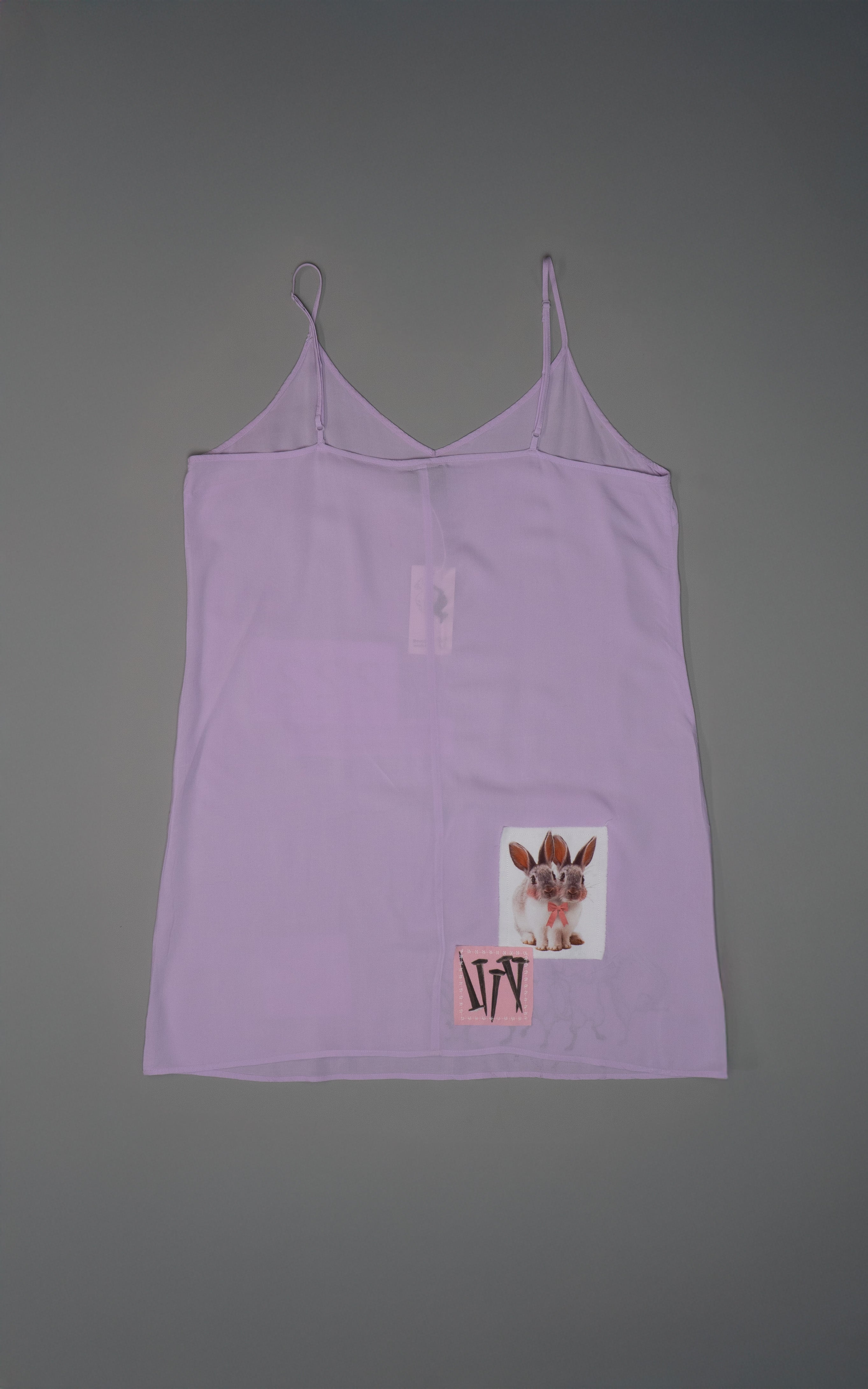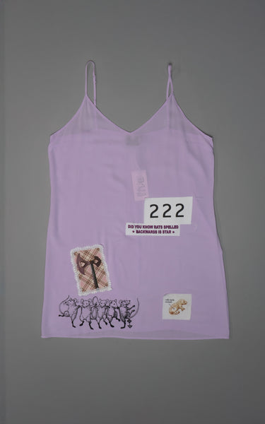 Light purple cotton summer dress with screen-printed rat design and multiple sewn patches. Screen made in our studio and patches printed in Croatia. Thrifted from Slovenia. Adjustable straps.
