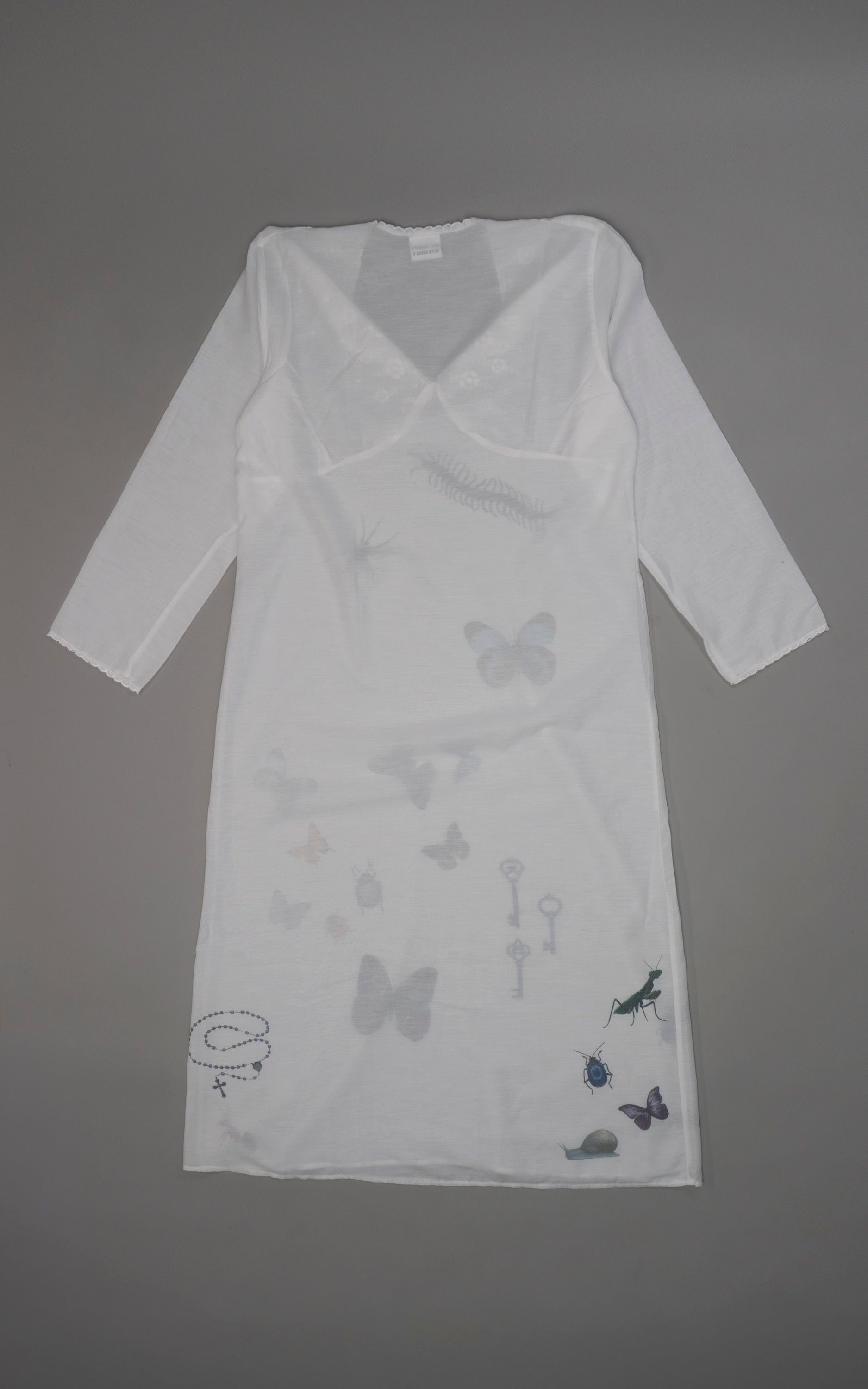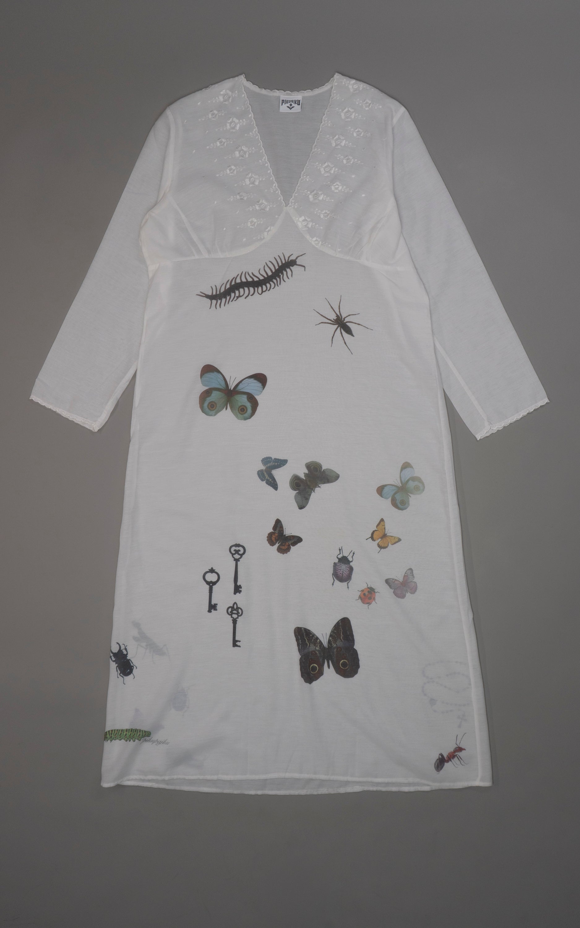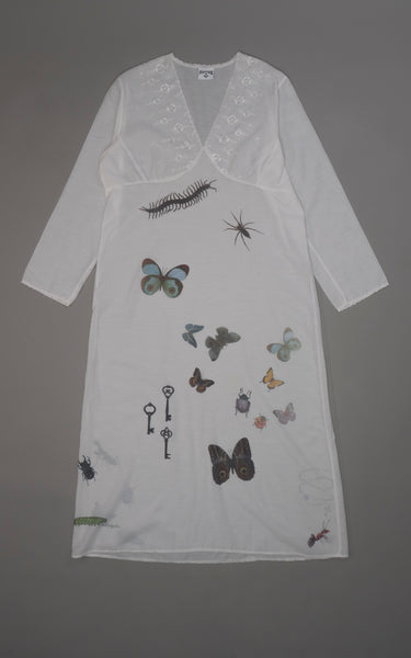 Gorgeous vintage nightgown sprinkled with bugs. Slightly see-through with embroidery detailing on the chest. May have some stains due to vintage condition, but none are directly visible.